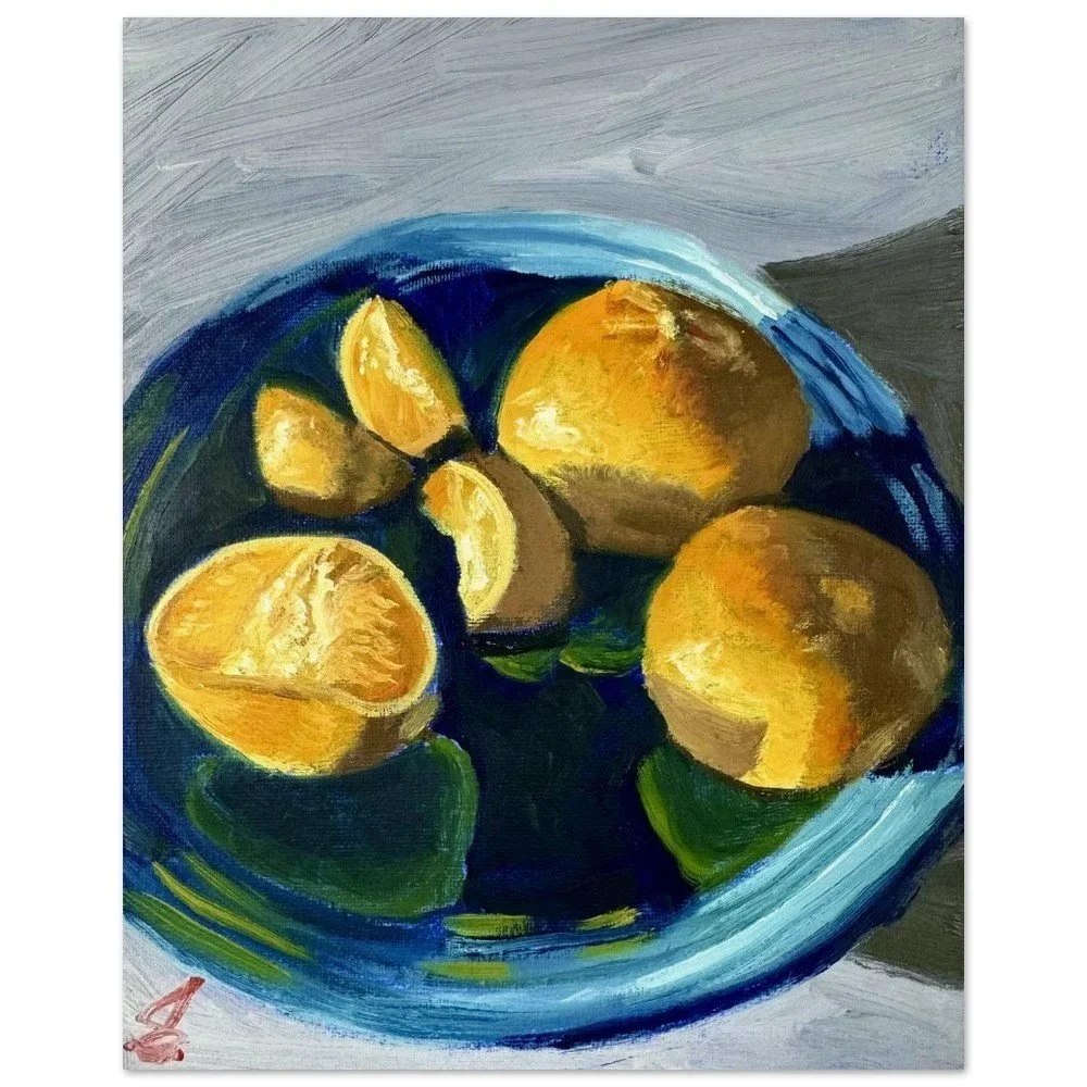 8” x 10” oil painting on canvas. Sophisticated still life featuring three mandarin oranges on a glossy plate. Dazzling colors and subtle reflections bring this painting to life.