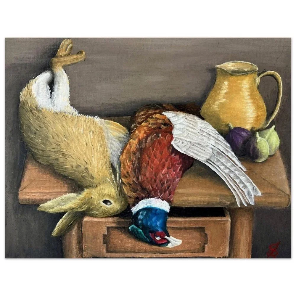 11” x 14” Oil painting on canvas. This cozy still life expresses the complex relationship between life and death. Here is a reminder of where real food comes from.